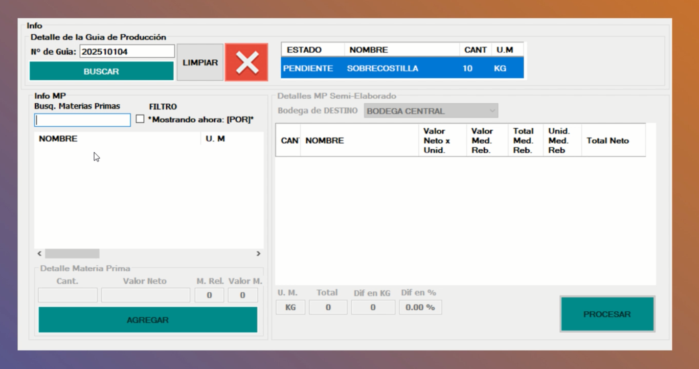 Esta guía impresa será usada por el personal que la produzca, para anotar en que convirtió la materia prima, para el ejercicio fue solo hamburguesas, pero de un corte podrían derivar a mas de una materia prima (elaborada). Con esto tendrás: ⇒ salida materia prima sin procesar ⇒ a procesada, debiendo coincidir Peso final de producto mas merma. ⇒ Si salieron 10KG de bodega central, deberían volver ⇒ 10KG en producción. (MP Procesada + Merma)
