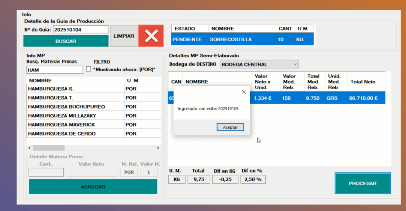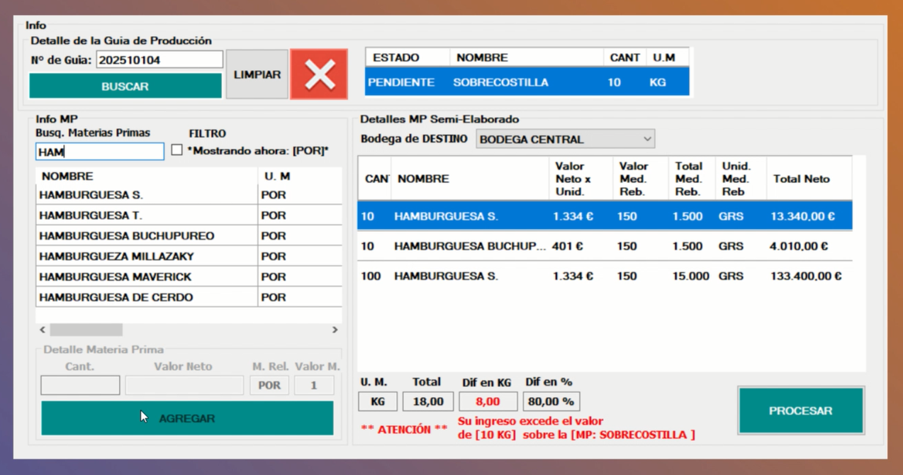 Ejem: Sobrecostilla 10KG ⇒ se produjo ⇒ (65) Hamburguesas S ⇒ (250grs) merma.