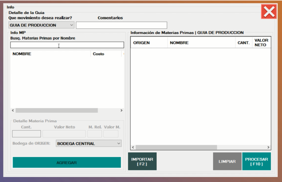 ⇒ Buscamos las materias primas producidas para ingresarlas al sistema, ya elaborada.