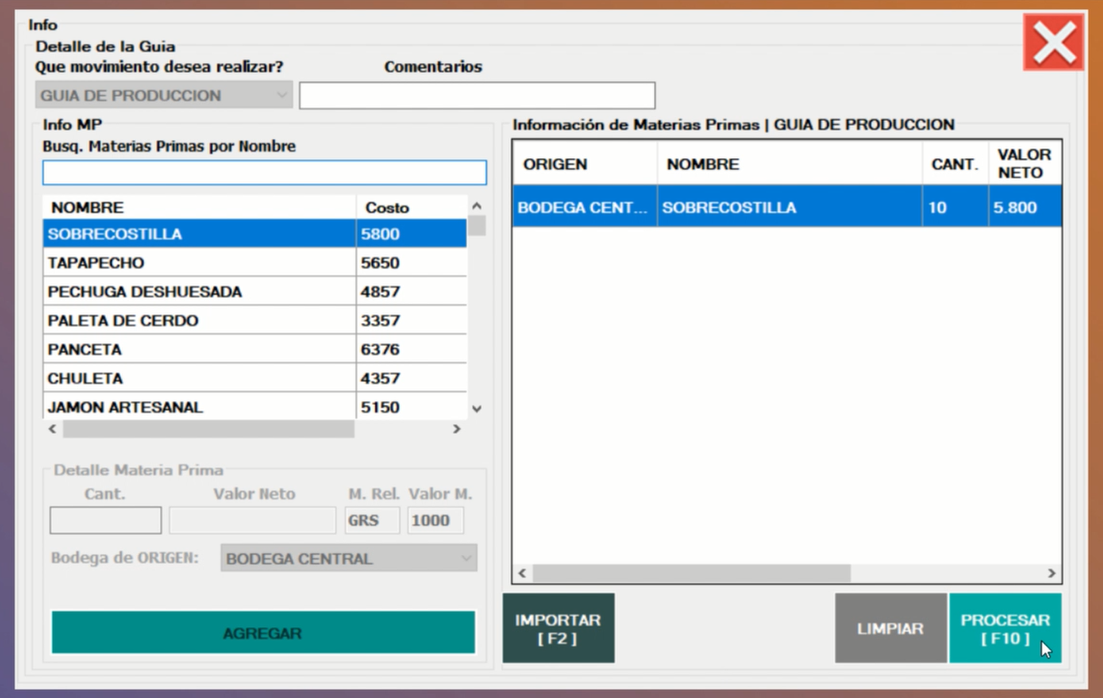 - Sobrecostilla ⇒ Saldrá de Bodega central para Producción y volverá nuevamente ya procesada.