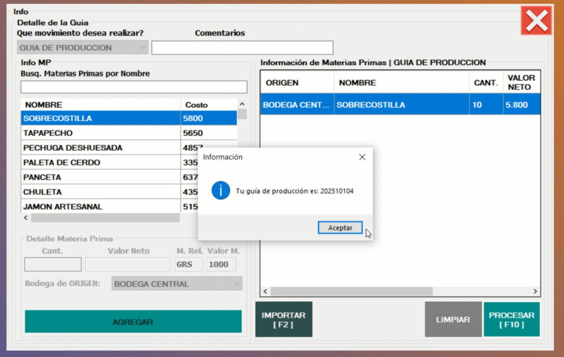 ⇒ Al procesar, nos generara una Guía de Producción N°.