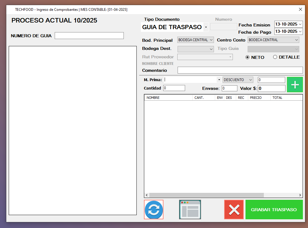 - Si volvemos a seleccionar la guia de traspaso, se nos mostrara las guias del proceso (mes). podremos Editar o Imprimir la guia de ser necesario.