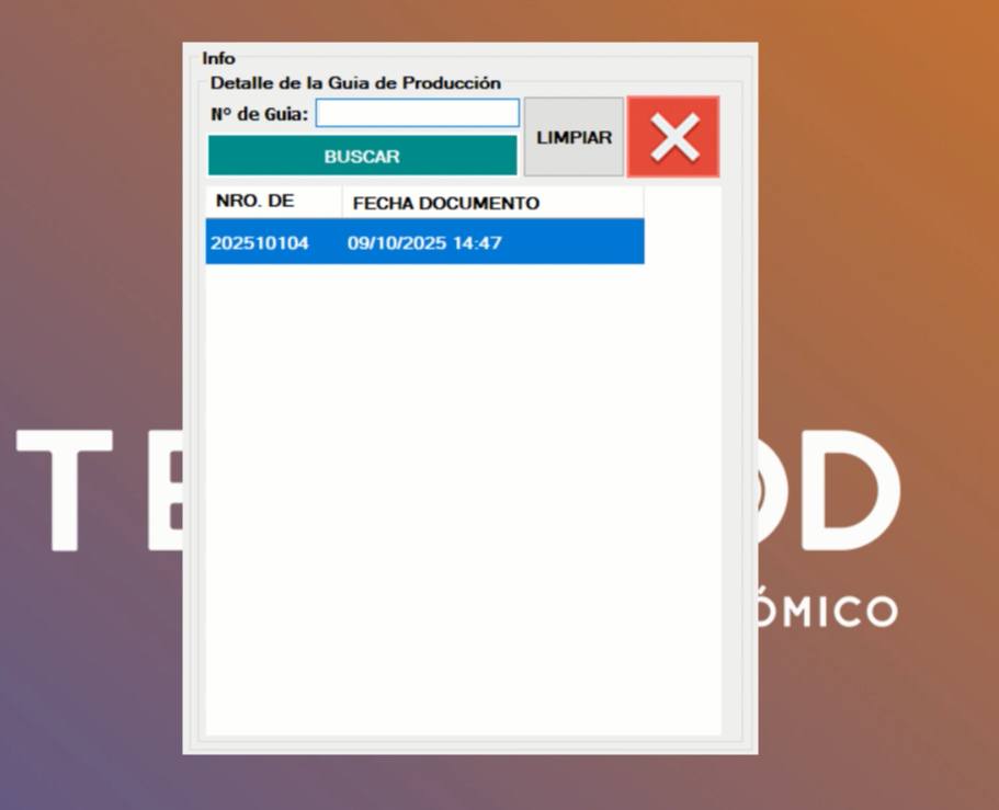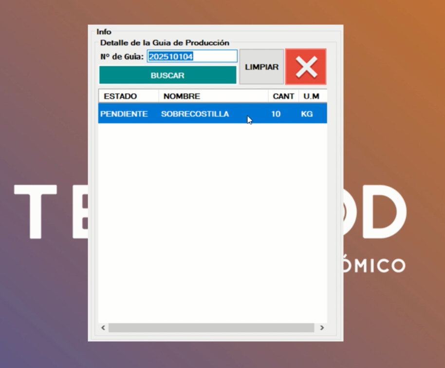 ⇒ Se desplegara la información de la guía de producción. ⇒ Confirmas los datos que sea la guía que deseas procesar