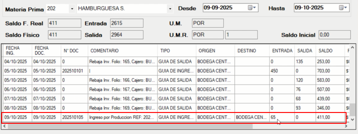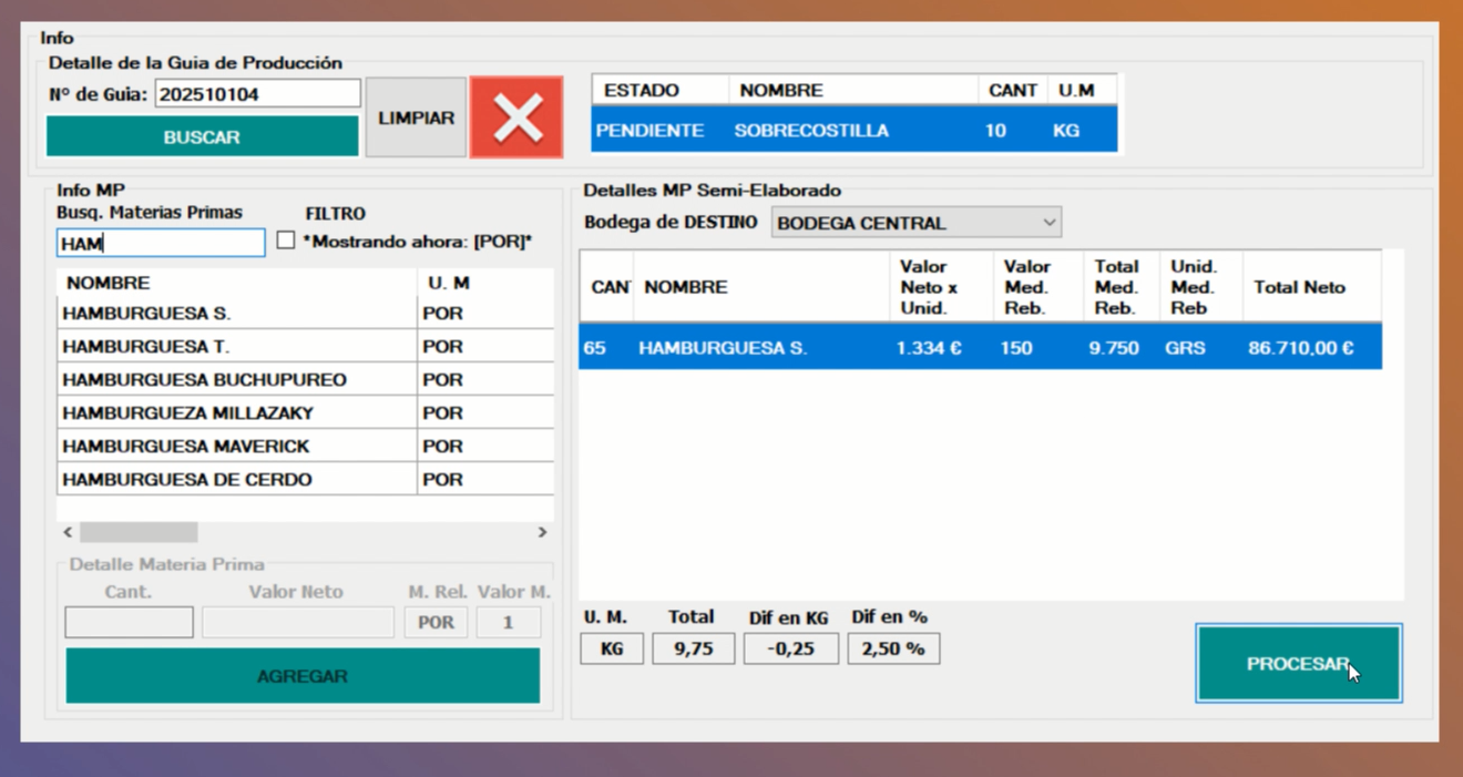 Ejem: Sobrecostilla 10KG ⇒ se produjo ⇒ (65) Hamburguesas S ⇒ (250grs) merma.
