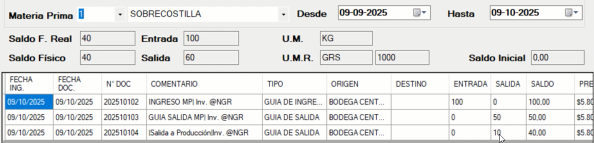 Mostrare brevemente como se representaran los datos en el Modulo de Cartola de Materias Primas los movimientos realizados.