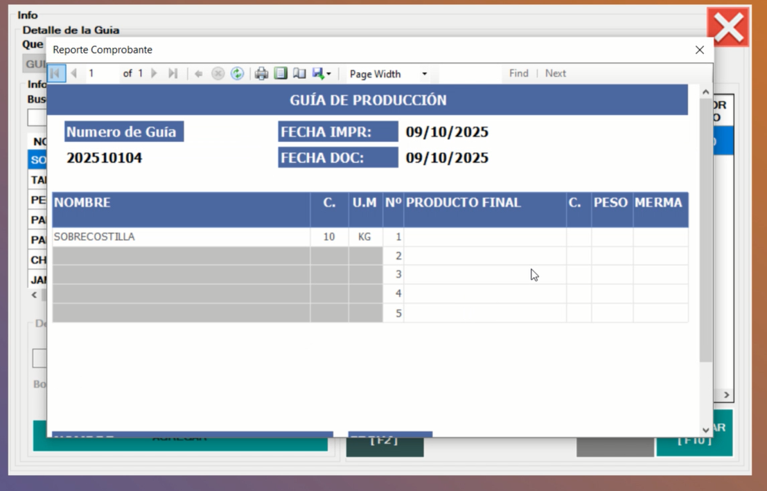 Esta guía impresa será usada por el personal que la produzca, para anotar en que convirtió la materia prima, para el ejercicio fue solo hamburguesas, pero de un corte podrían derivar a mas de una materia prima (elaborada). Con esto tendrás: ⇒ salida materia prima sin procesar ⇒ a procesada, debiendo coincidir Peso final de producto mas merma. ⇒ Si salieron 10KG de bodega central, deberían volver ⇒ 10KG en producción. (MP Procesada + Merma)