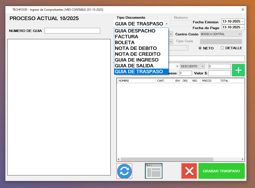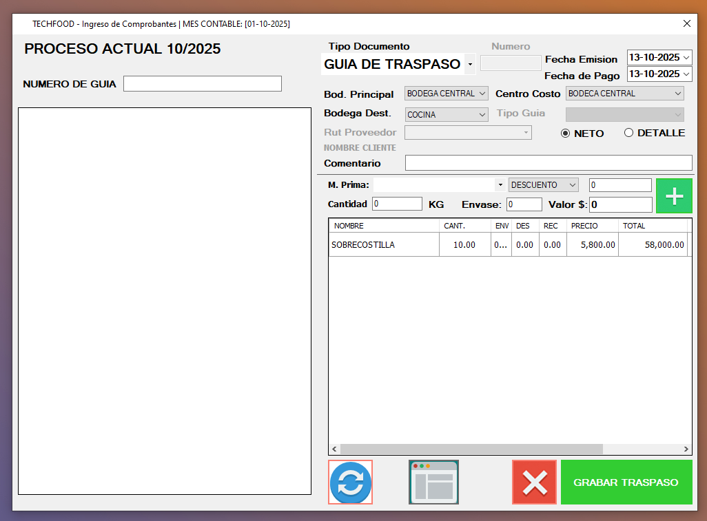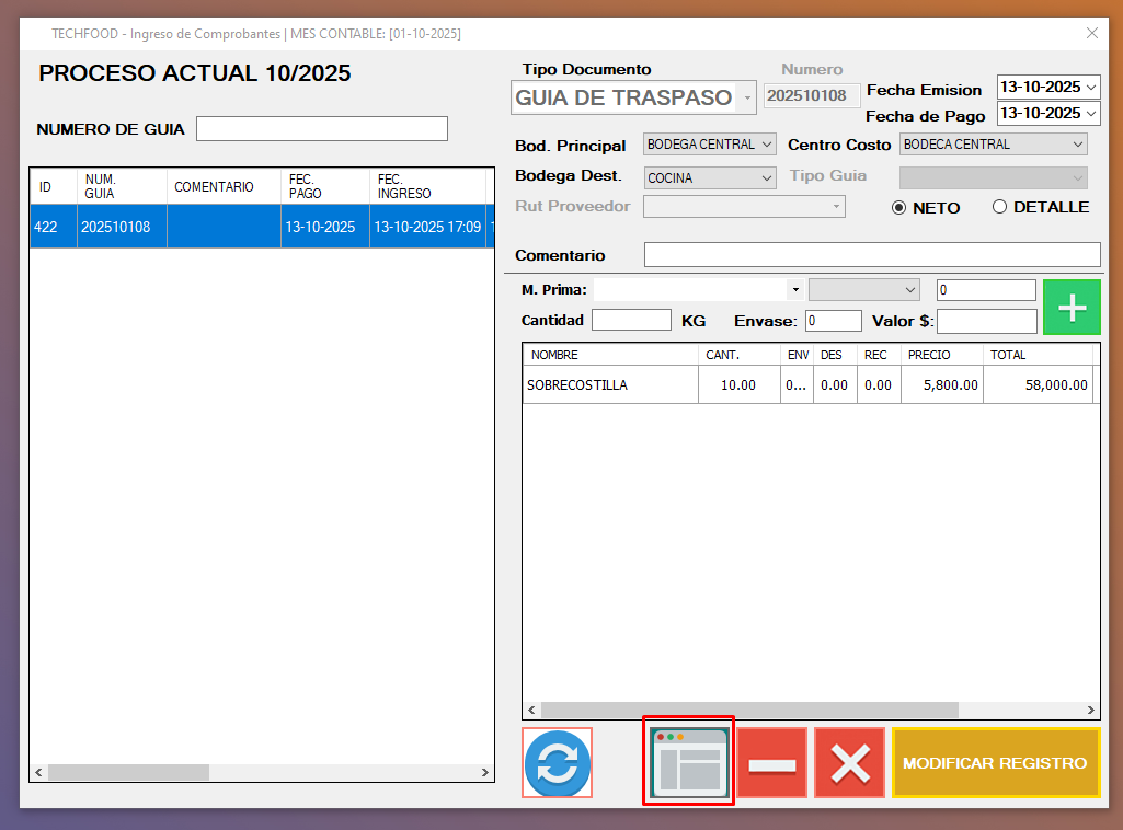- Si volvemos a seleccionar la guia de traspaso, se nos mostrara las guias del proceso (mes). podremos Editar o Imprimir la guia de ser necesario.