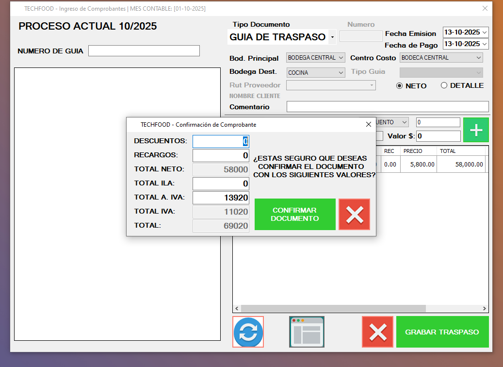 Traspasar de: Bodega Central a Cocina