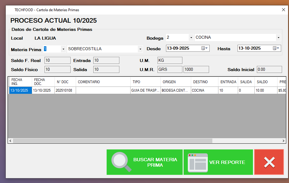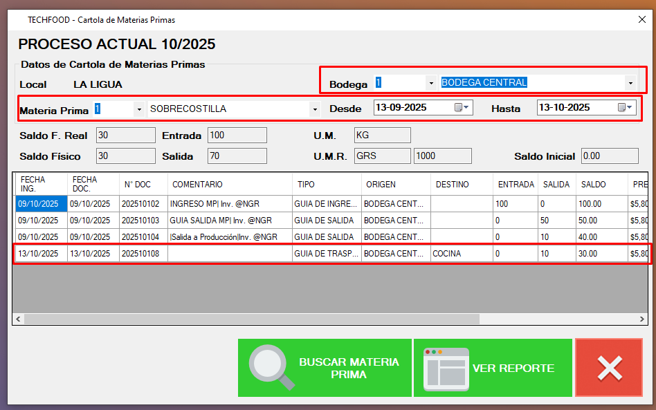 Estos detalles de movimiento de materias primas se podrán ver a detalle en el modulo de Cartola de Materias Primas. Bodega Central: