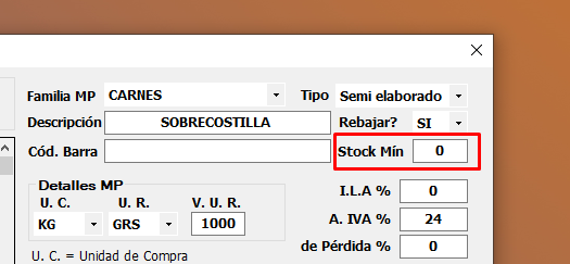 Esta información hace referencia al campo del **Modulo Materias primas ** Stock Min.